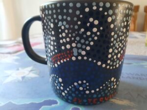 Gdy wyszłam z jachtu moją uwagę przykuły stojące na falochronie, znajome kubeczki w motywami jachtowymi malowane charakterystycznymi kropeczkami. Jakiś czas temu pływając z Andrzejem na Tequili odwiedziliśmy Trzebież, a w niej Elę Blondynkę i różową ławeczkę stojącą pod jej jachtem S/Y Dziwna, który dzielnie remontuje. Ela maluje te kubeczki, a brat oczywiście kiedyś taki nabył i zawsze lubiłam właśnie z niego pić herbatę. Zatrzymałam się więc przy kubeczkach radośnie komentując, że znam je bo na Tequili taki jest. Ela skojarzyła mnie i rzuciła się do poszukiwań w przepastnej torbie. Po chwili triumfalnie wyciągnęła z niej kartonik z kubeczkiem i z dużym wzruszeniem wręczyła go mnie mówiąc, że namalowała go dla Andrzeja i nie zdążyła mu go dać … Prawie się popłakałyśmy obie. Codziennie piję z niego herbatę wspominając Elę, Trzebież i Tequilę.